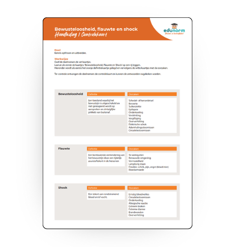 Alle gegevens bekijkenOpleidingsset Bewusteloosheid, Flauwte en Shock Wil je gericht oefenen met de signalen en oorzaken van bewusteloosheid, flauwte en shock? Deze set ...